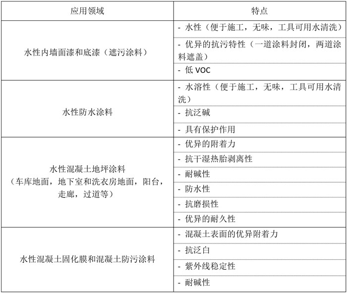水性,低VOC 優(yōu)異的抗污特性 抗泛白 耐堿性 優(yōu)異的附著力 抗磨損性 優(yōu)異的耐久性 |
